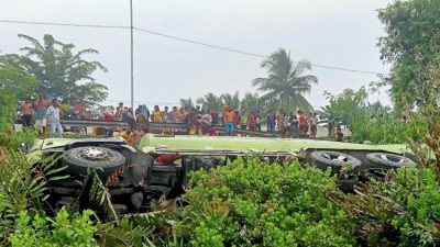 Info yang dihimpun awak media menyebutkan ,Tergulingnya mobil Tanki berplat polisi BK 8864 FG yang dikemudikan Harianto (40) mengatakan ” ia terpaksa banting stir.