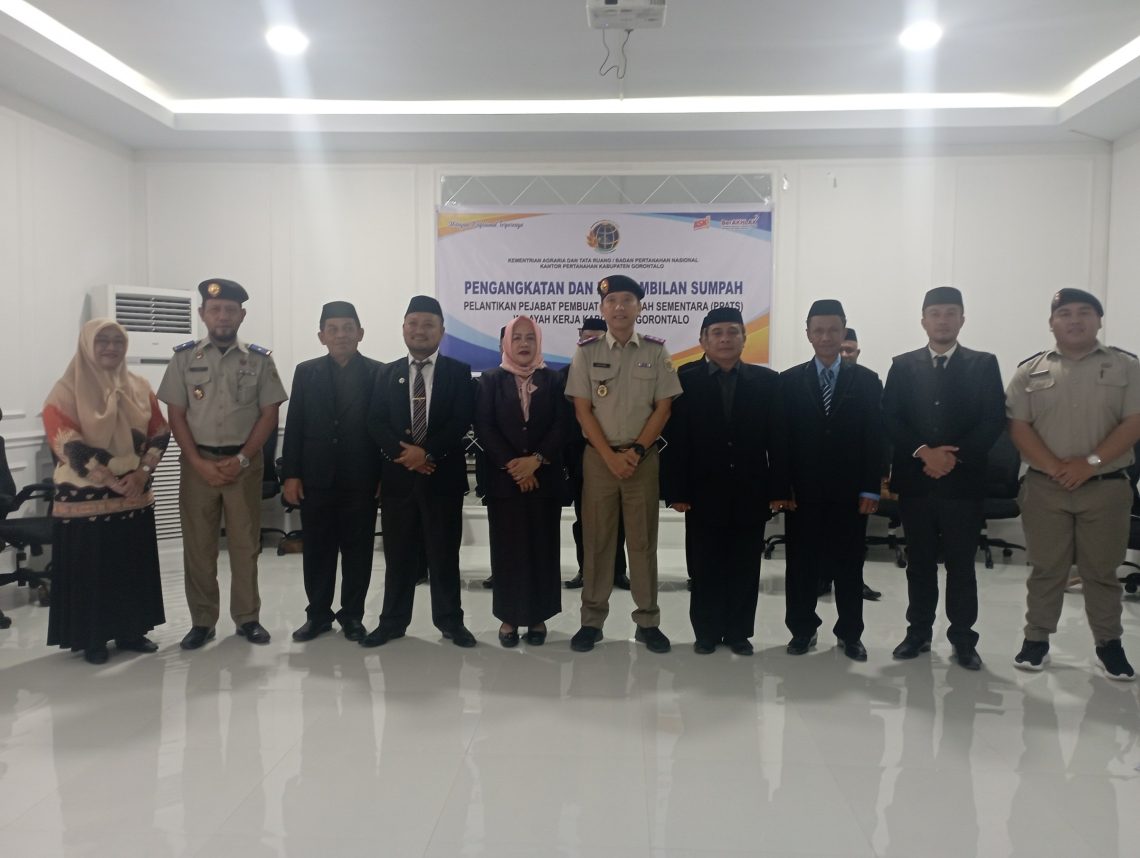 Pengangkatan dan pengambilan sumpah 11 orang Camat di Wilayah kerja Pemerintah Kabupaten Gorontalo oleh Kepala Kantor Pertanahan Royger Maniur Simanjuntak pada tahun 2024 ini sesuai dengan surat dari Kepala Badan Pertanahan Wilayah Provinsi Gorontalo.
