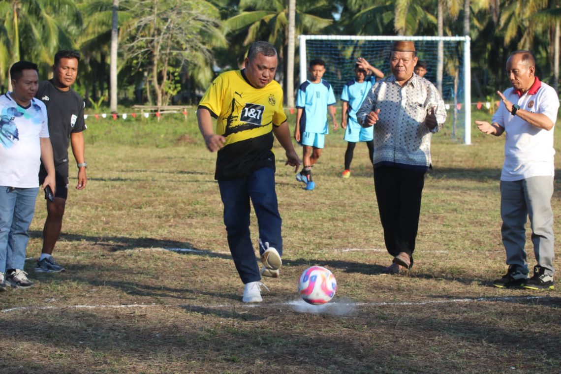 JARAK.ID (GORONTALO) – Wakil Bupati (Wabup) Kabupaten Gorontalo, Hendra Hemeto melakukan tendangan pertama sebagai tanda membuka secara resmi kegiatan turnamen Sepak Bola Liga One Alo di Lapangan Desa Buhu, Kecamatan Tibawa, Minggu (11/08/2024).