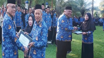 JARAK.ID, GORONTALO__ Bupati Gorontalo Sofyan Puhi dan Wakil Bupati Gorontalo Tonny Junus memberikan penghargaan kepada 28 Aparatur Sipil Negara (ASN) di lingkungan Pemerintah Kabupaten Gorontalo, di apel Kopri yang digelar di halaman kantor bupati, Kamis (17/4/25).