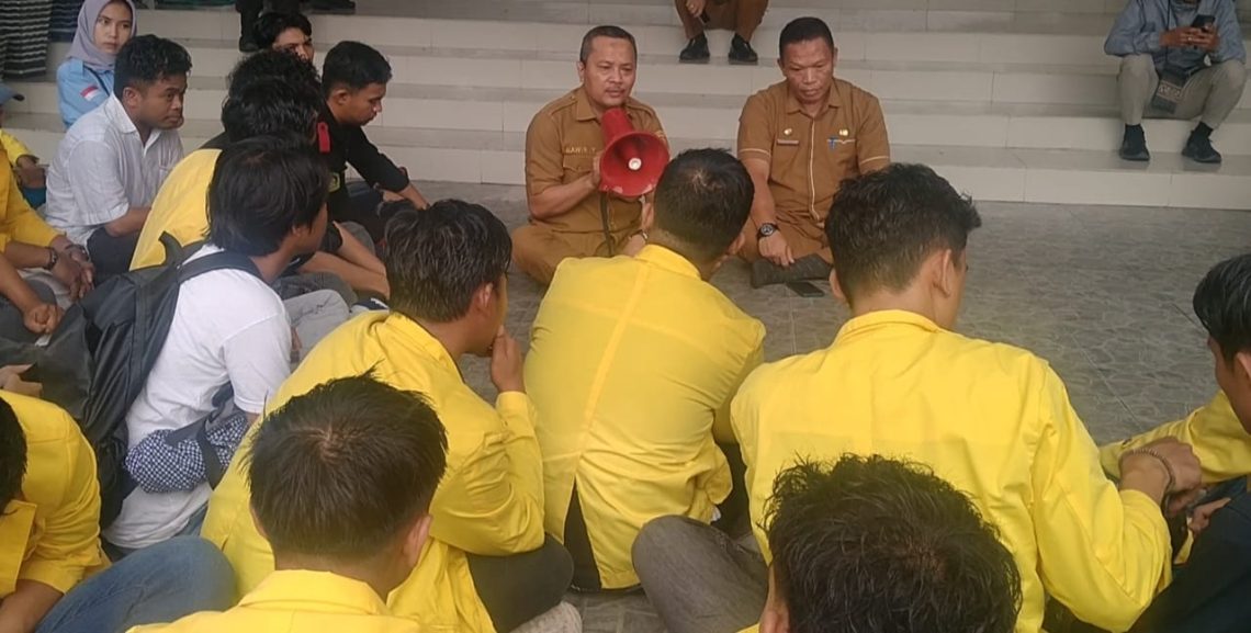 Sementara itu, Darwin Romi Syahrain, selaku Asisten dua Setda Pemerintah Kabupaten Gorontalo bersama Nawir Tondako Asisten Satu Setda Pemerintah Kabupaten Gorontalo dan Kepala Badan Kesbangpol Kabupaten Gorontalo menerima Burhan Ismail saat menerima massa aksi menyampaikan permohonan maaf atas ketidak hadiran bupati di tempat.