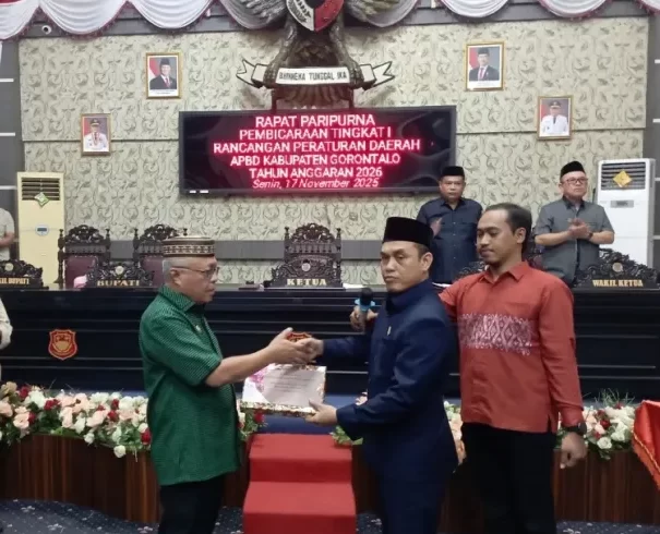JARAK.ID GORONTALO Pemerintah Kabupaten (Pemkab) Gorontalo bersama Dewan Perwakilan Rakyat Daerah (DPRD) melaksanakan rapat Paripurna Pembicaraan Tingkat I Rancangan Peraturan Daerah (Raperda) tentang Anggaran Pendapatan Belanja Daerah (APBD) tahun 2026, Pada Senin (17/11/2025.