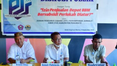 JARAK.ID [GORONTALO] – Bupati Kabupaten Pohuwato, Syaiful Mbuinga diwakili oleh Asisten II Pemkab Pohuwato, Dr.Ir.Fikri Adam.,M.Si.,MM menghadiri acara Dialog Publik dengan tema : Izin Penjualan Depot BBM Bersubsidi Perlukah Diatur? yang digelar oleh Organisasi Perhimpunan Jurnalis Siber (PJS) Kabupaten Pohuwato, di Kedai Inspirasi Marisa, Jumat (9/9/2022).
