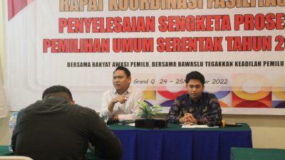 “Atas kewenangan menyelesaikan sengketa proses Pemilu, Bawaslu Kabupaten Gorontalo menggelar kegiatan rapat koordinasi fasilitasi,” ujarnya di Hotel Grand Q Kota Gorontalo, Kamis (22/11/2022).