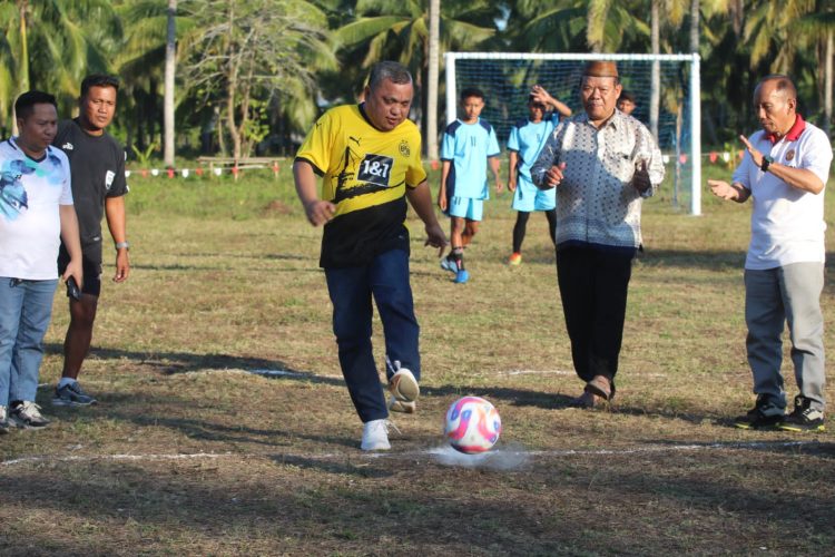 JARAK.ID (GORONTALO) – Wakil Bupati (Wabup) Kabupaten Gorontalo, Hendra Hemeto melakukan tendangan pertama sebagai tanda membuka secara resmi kegiatan turnamen Sepak Bola Liga One Alo di Lapangan Desa Buhu, Kecamatan Tibawa, Minggu (11/08/2024).