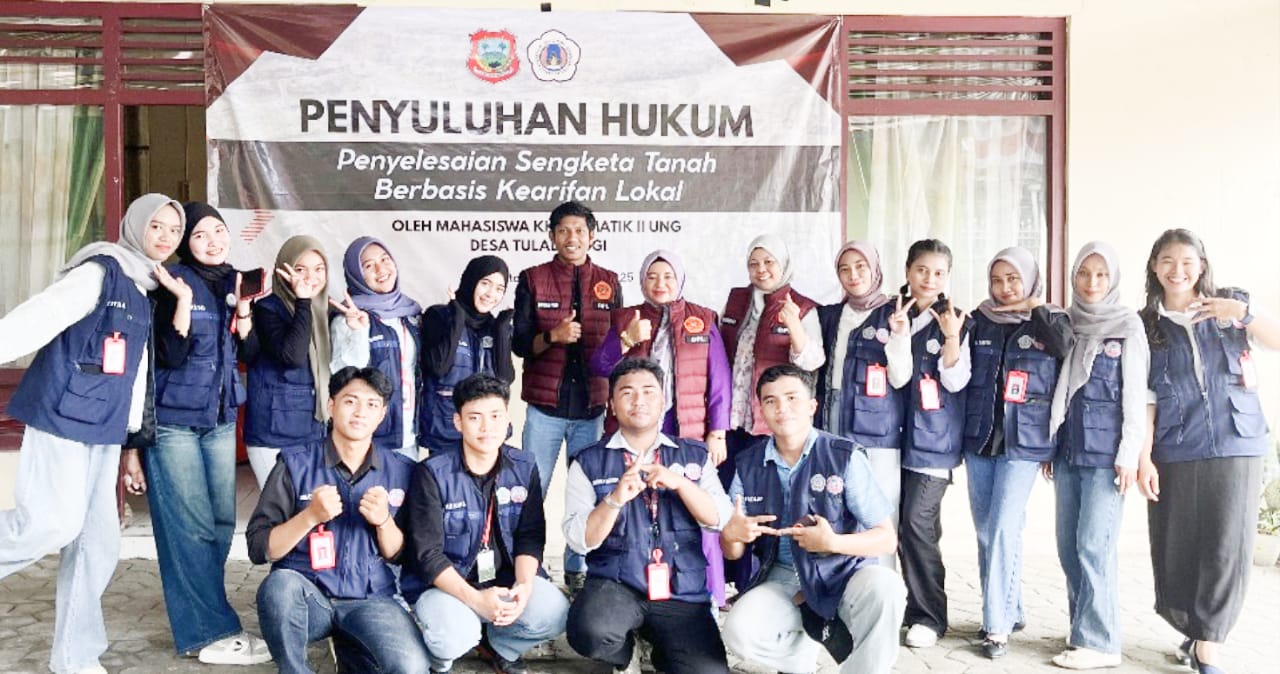 JARAK.ID GORONTALO – Mahasiswa Kuliah Kerja Nyata (KKN) Tematik II Universitas Negeri Gorontalo (UNG) dari Fakultas Hukum menggelar kegiatan penyuluhan hukum dengan tema “Penyelesaian Sengketa Tanah Berbasis Kearifan Lokal” di Balai Desa Tuladenggi, Kecamatan Telaga Biru, Kabupaten Gorontalo, (28/08/2025).