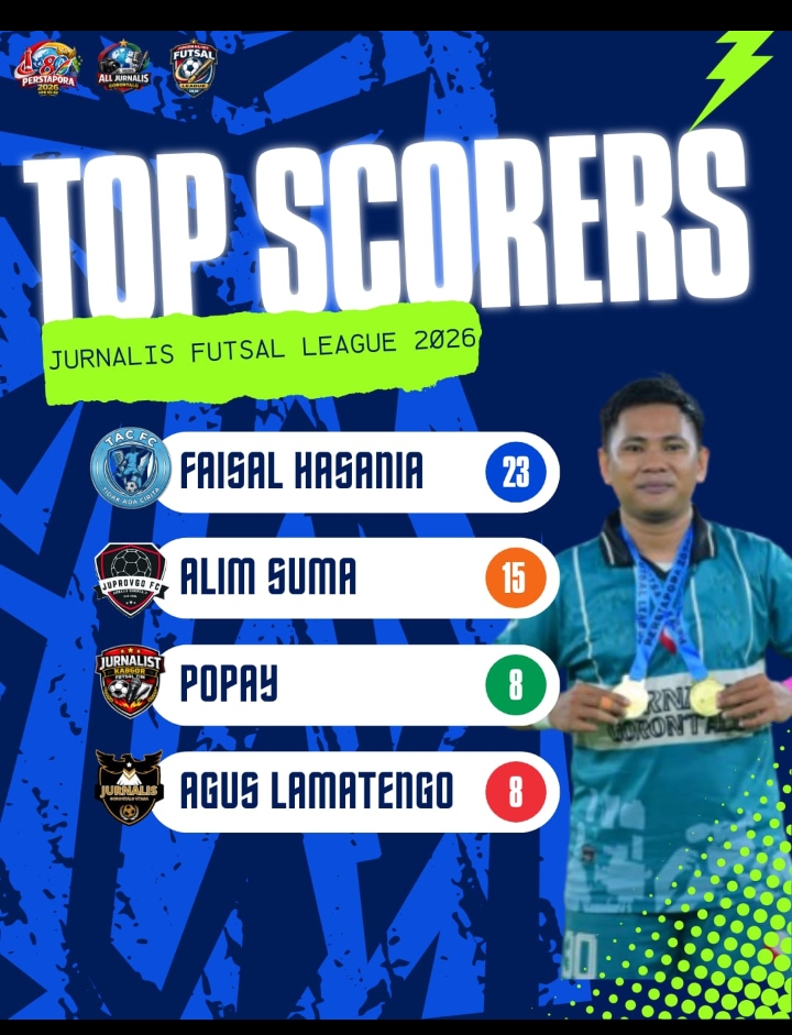 JARAK.ID, GORONTALO – Jurnalis Futsal League dalam rangka memperingati Hari Pers Nasional (HPN) ke- 80 tahun 2026, All Jurnalis Gorontalo telah menyelesaikan rangkaian laga pada hari Minggu, (08/02/2026) berikut ini daftar top skor.